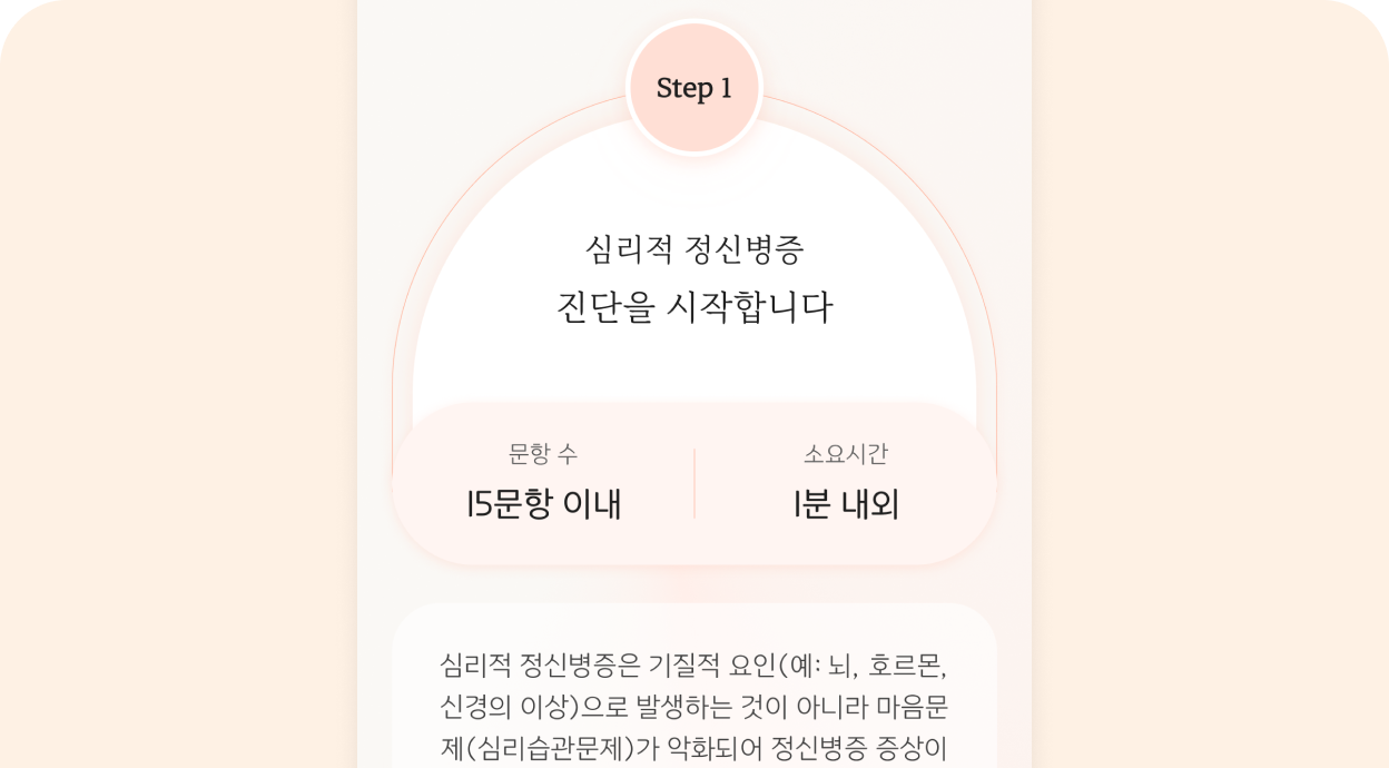 특허받은 ‘마음이론을 통한 심리치료 시스템’(10-2770181)을 기반으로 정신문제, 심리문제, 마음문제를 구분하여 자신의 마음 상태를 이해하고 필요한 조치를 할 수 있도록 돕습니다.