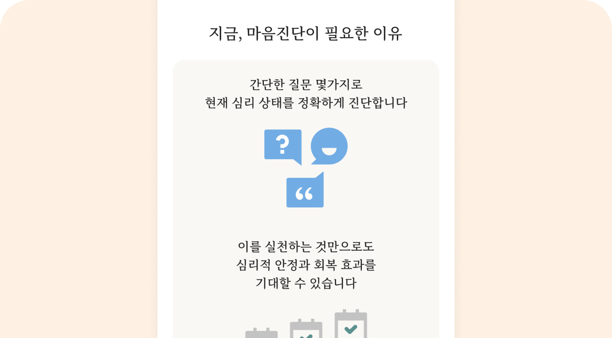 마음진단은 간단한 질문에 답하면서 현재의 마음상태(정신문제, 심리문제, 마음문제)를 확인해 볼 수 있습니다.